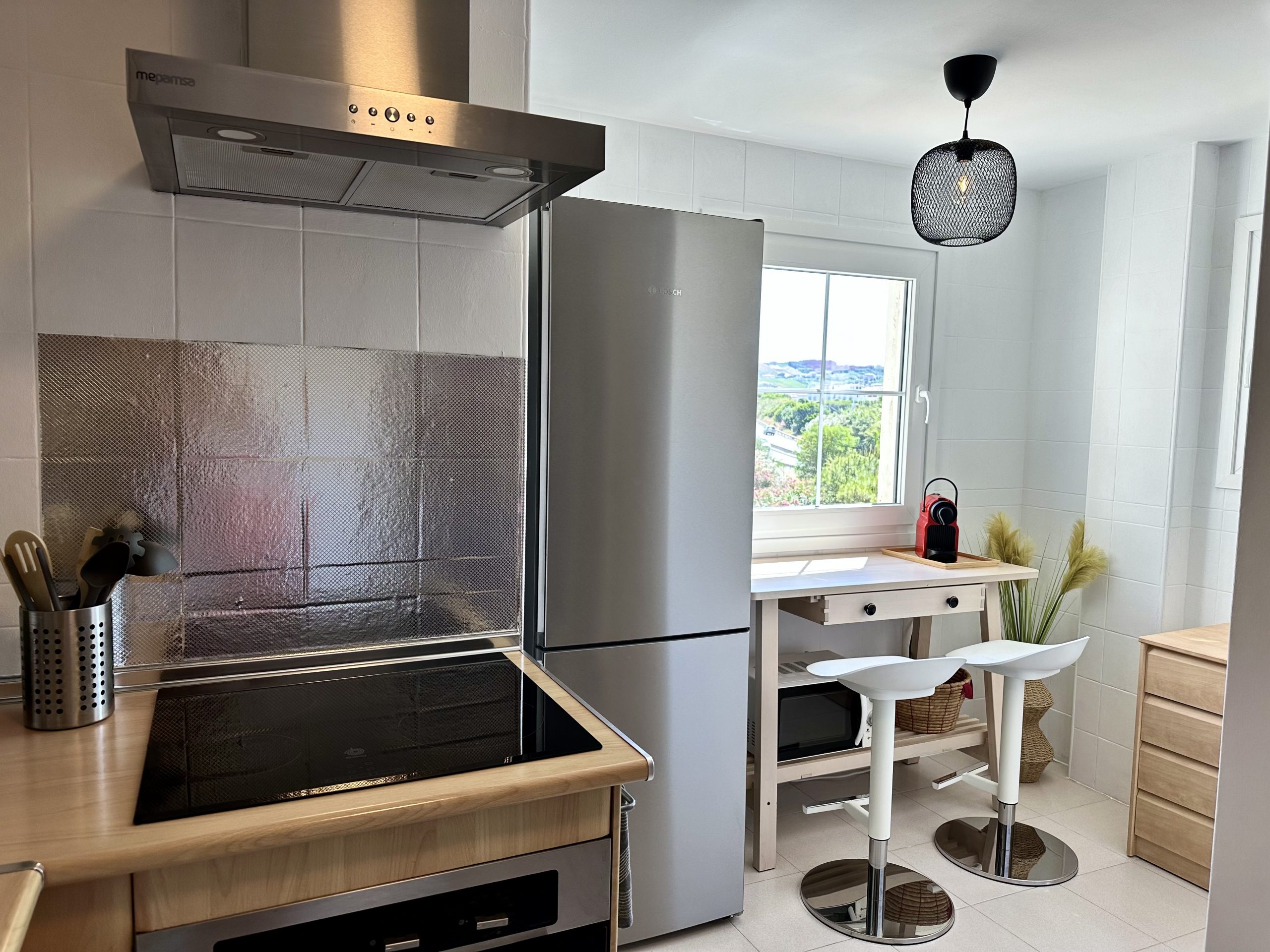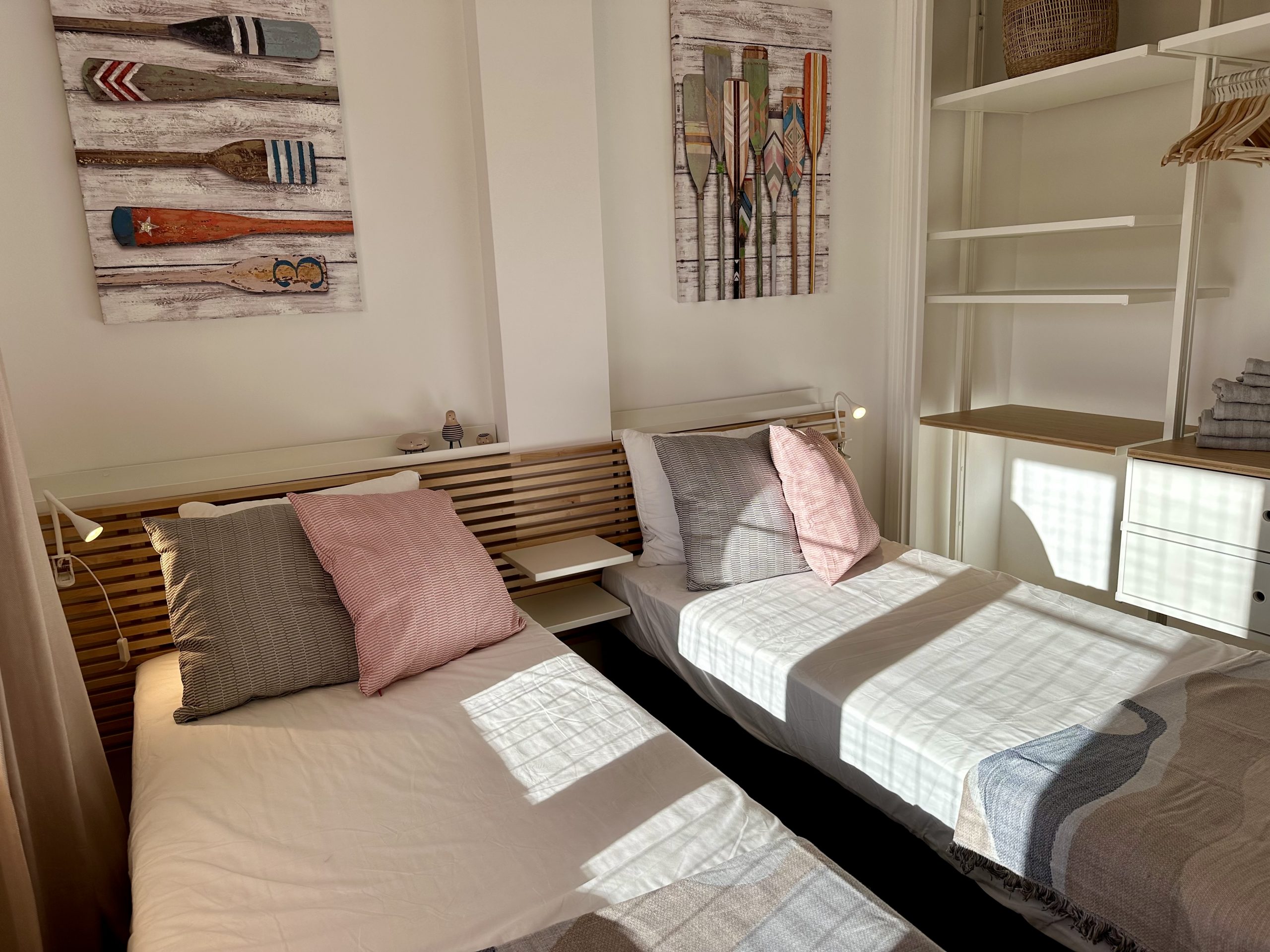 Choose from two cozy bedrooms: one with a queen bed (1.60m x 2m) and another with two single beds (0.9m x 2m), one offering direct access to a private balcony where you can savor the view. The larger balcony extends from the living area, perfect for basking in the ambiance.